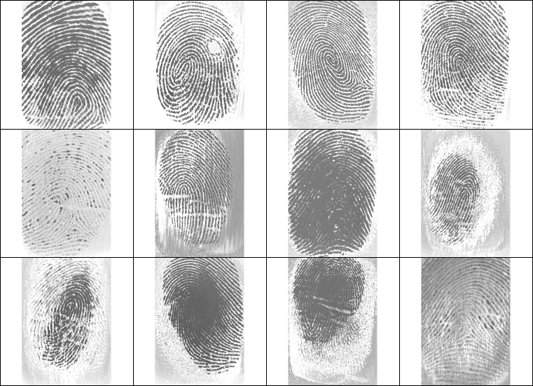 Images from DB2; all the samples are from different fingers and are ordered by quality (top-left: high quality, bottom-right: low quality):
